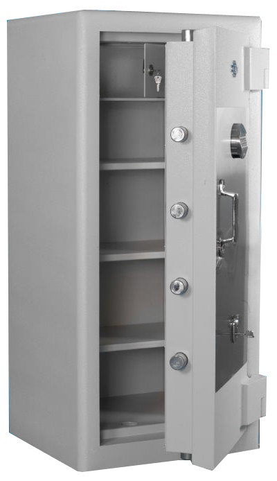 ΚΑΤΑΣΚΕΥΗ: Ο θώρακας της πόρτας και του σώματος του χρηματοκιβωτίου αποτελούνται από ένα εξωτερικό και ένα εσωτερικό έλασμα. Το έλασμα είναι κατηγορίας DIN 17100 RCT 37-2.Η πόρτα των χρηματοκιβωτίων ασφαλίζει περιμετρικά με δώδεκα (12) συμπαγείς πείρους κυλινδρικής ολισθήσεως.